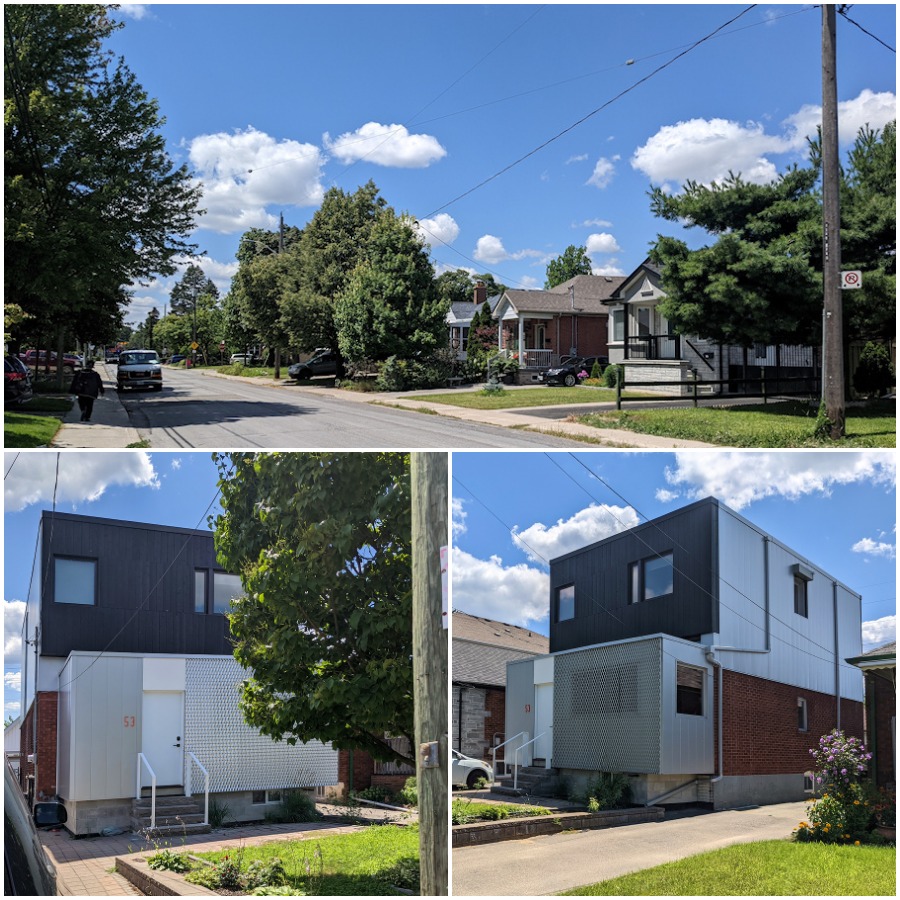 А вот тут я все-таки поворчу. Сверху на коллаже - моя улица. Вполне обычная для нашего города, застроена лет сто назад в основном одноэтажными домами. Разумеется, нынче домовладельцам "маловато будет", так что дома постепенно перестраиваются. Иногда (довольно редко) сносят и строят новый c нуля, чаще пристраивают второй, и порой и третий этаж или жилую мансарду вместо чердака, меняют фундамент, поднимают потолки в цокольных этажах. В целом стиль "дом обыкновенный" сохраняется. Но иногда новых домовладельцев посещают свежие дизайнерские идеи. Вот как на картинках внизу. Да, до прошлого года это был милый такой кирпичный одноэтажный домик с покатой крышей. Я как увидела, так у меня глазки-то повыпали. У девицы, к слову, тоже - это она меня попросила архитектурный шедевр увековечить заодно со всей улицей. Эдакий номер на контрасте.