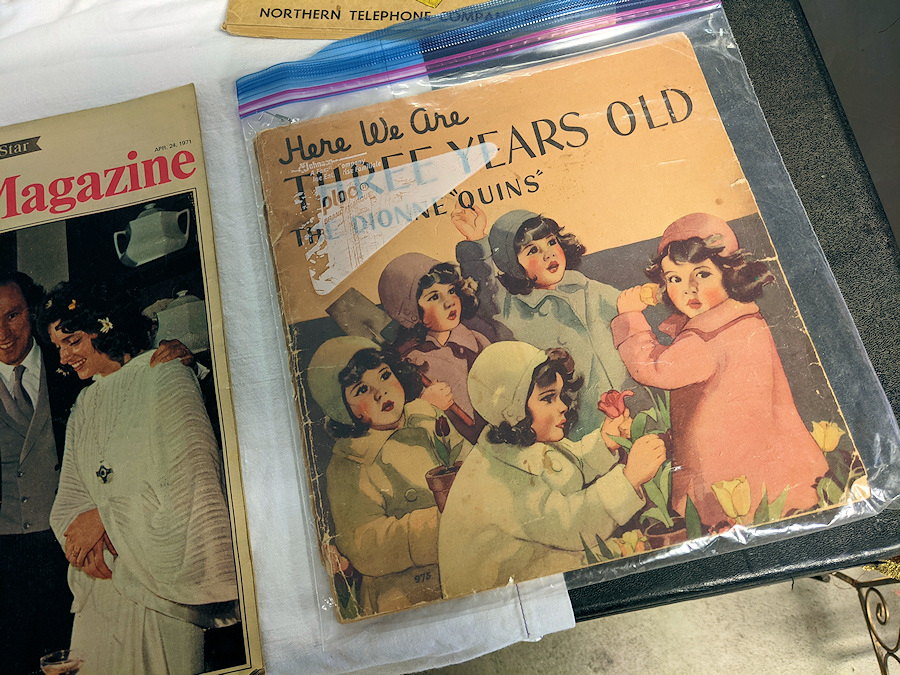 К концу лета наконец открылся воскресный антикварный рынок. Вот про это я много слышала и читала, но никогда не видела - рекламный журнальчик про сестер Дион. Мои ровесники, фотографию сестричек Дион из учебника биологии помните? К слову, довольно солидную компенсацию за изуродованное детство правительство провинции Онтарио выплатило сёстрам уже на моей памяти, в конце девяностых.